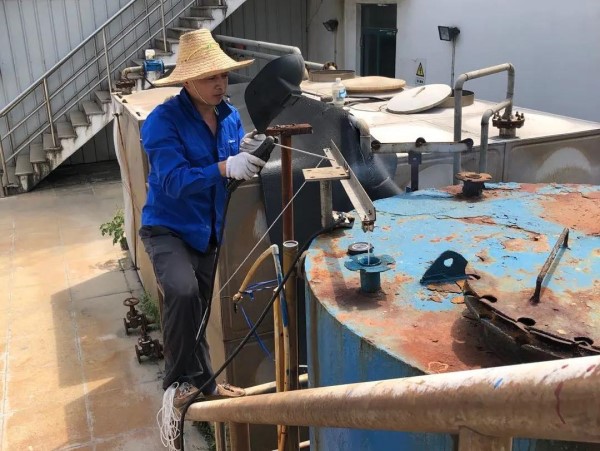 驕陽(yáng)下的焊接作業(yè),設(shè)備維修時(shí)不我待。接到生產(chǎn)巡檢人員的報(bào)修信息,需要焊接作業(yè),正午的點(diǎn),驕陽(yáng)炙烤。桐鄉(xiāng)污水公司機(jī)電部機(jī)修工沈新學(xué)可顧不了那么多,設(shè)備安全事關(guān)生產(chǎn)安全,維修一刻也不能等。抓起一簾草帽,背起焊接工具箱,直奔維修點(diǎn)。駕輕就熟,開始作業(yè),汗珠一顆顆從臉頰、身上滾落,一刻也不曾停歇。