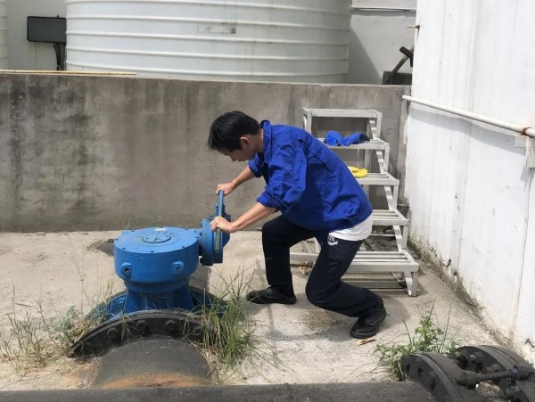 烈日下堅(jiān)守,保障污水生產(chǎn)安全。污水凈化回用,還城市一份潔凈的世界,給市民一個(gè)清涼的夏日。桐鄉(xiāng)污水公司生產(chǎn)部運(yùn)行工顧振賢像往日一樣仔細(xì)巡查著生產(chǎn)區(qū),發(fā)現(xiàn)閥門有些松動(dòng)的跡象,安全生產(chǎn)不可馬虎,一定要防微杜漸,他立即找來(lái)工具,使出渾身的力氣,擰一擰,緊一緊,終于可以放心。汗水濕透衣背,這是最美的“蹲馬步”。