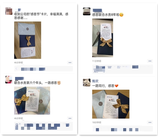 家屬參觀活動的熱情還未褪去,26日,感恩節(jié)當(dāng)天,贈送賀卡活動又將感恩的情緒推向了高潮。全公司近400名員工,無論是路途較遠(yuǎn)的區(qū)域供水服務(wù)中心亦或是各座增壓泵站,每一名員工都收到了感恩賀卡,驚喜之余更多的是感動。在二水廠,公司領(lǐng)導(dǎo)親自為員工代表贈送賀卡,并合影留念。小小賀卡,情深義重。雖寒風(fēng)凜冽,卻擋不住這份融融愛心,于是,公司員工們的朋友圈沸騰了,愛心涌動,展示賀卡的同時(shí),更多的是表達(dá)對公司的感謝、感激與感恩。