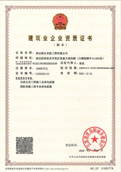 近日,宿遷聯(lián)合市政工程有限公司成功取得了新一期安全生產(chǎn)許可證,標志著公司市政公用工程資質證書延續(xù)換證工作圓滿完成。