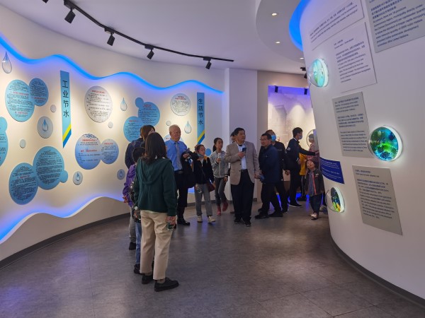 參觀完取水、制水、水質(zhì)檢測、送水調(diào)度等,大家?guī)е鴮ψ詠硭囊欢ㄕJ識,走進了位于公司二水廠、由聯(lián)合水務(wù)集團全資打造的宿遷市水文化展示館。從論水展區(qū)的無源之水、萬源之源、水脈里程等展項到制水展區(qū)、節(jié)水展區(qū),大家通過聲、光、電、影等手段多維度地了解宿遷市的自來水和水文化,對宿遷市供水事業(yè)的發(fā)展、水文化和節(jié)水理念有了更為深入的認識和深刻的記憶。孩子們紛紛在留言墻留言,表示要積極參與到節(jié)水行動中來。