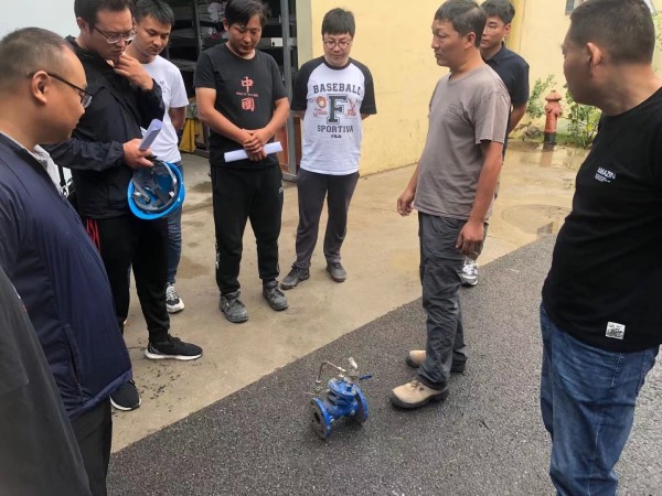 最先進(jìn)行的是機(jī)械方面的培訓(xùn),王工向大家詳細(xì)介紹了隔膜式浮球閥的工作原理和常見(jiàn)故障分析,通過(guò)他的講解,大家了解到這種型號(hào)的浮球閥常見(jiàn)的故障主要有三種:第一種是水箱液位達(dá)到設(shè)定高度時(shí),主閥仍然進(jìn)水,主要原因時(shí)控制水腔內(nèi)沒(méi)有形成壓力,這時(shí)候可檢查浮球閥是否能夠關(guān)閉、主閥膜片是否損壞、針閥是否堵死或者針閥前的管路是否暢通等原因來(lái)排查;第二種時(shí)水箱內(nèi)液面很低,主閥不能開(kāi)啟供水,這時(shí)需要檢查主管路上是否有其他閥門(mén)處于關(guān)閉狀態(tài),管路壓力是否正常,檢查球閥到浮球閥的管路是否暢通等方面;最后一種是有異物卡死閥芯,這種情況需要解體主閥取出異物才能排除故障。
