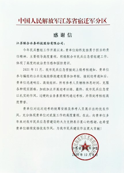 近日,江蘇省宿遷軍分區(qū)開展民兵年度考核驗收工作,經(jīng)過一天的考核,最終以扎實的作風、過硬的業(yè)務素質(zhì)順利通過省、市兩級驗收和考核。考核結(jié)束后,宿遷軍分區(qū)向公司發(fā)來感謝信,感謝聯(lián)合水務多年來對宿遷市民兵應急營建設的大力支持。