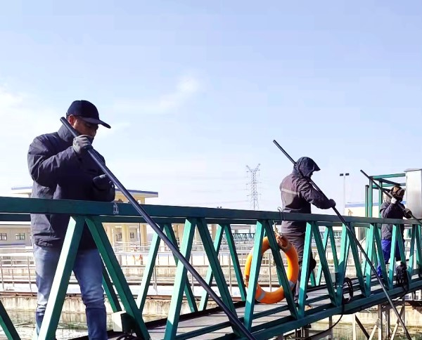 宿遷的最低溫度曾一度降至-10℃,在這樣嚴(yán)峻的低溫條件下,沉淀池池面結(jié)了一層厚厚的冰,制水部迅速組織人員開(kāi)展“破冰行動(dòng)”。在肆虐的寒風(fēng)之中,鑿冰能手們紛紛大展身手,使用硬質(zhì)PVC管將2厘米厚的冰面鑿碎,保證吸泥行車能夠正常行駛。