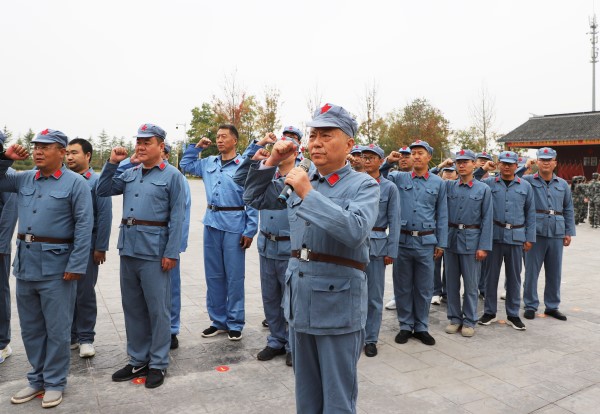 追尋紅色足跡,重溫入黨初心。在半城鎮(zhèn),大家穿著統(tǒng)一的紅軍軍服,懷著對(duì)紅軍將士的敬仰之情,徒步前往大王莊紅色教育基地,用重走長(zhǎng)征路的形式,感悟長(zhǎng)征精神。大王莊在抗戰(zhàn)時(shí)期曾是中共淮北區(qū)黨委、淮北蘇皖邊區(qū)行署、新四軍第四師和淮北軍區(qū)司令部所在地,被譽(yù)為“蘇皖紅土地,淮北小延安”。走在教育基地青灰的舊石板路上,映入眼簾的是泥土墻、茅草屋面、柳山石圍墻……基地依托新四軍四師師部舊址改建而成,再現(xiàn)了彭雪楓、劉瑞龍等老一輩革命家生活戰(zhàn)斗的歷史場(chǎng)景。在濃厚的革命氣息中,大家駐足觀看,感受著共產(chǎn)黨人的初心使命,追憶著黨的崢嶸歲月,從革命先驅(qū)的奉獻(xiàn)精神中汲取前進(jìn)的動(dòng)力。