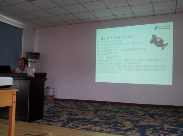 三川公司的桂經(jīng)理就普通型水表的種類、運(yùn)行原理、安裝規(guī)范、注意事項(xiàng)、檢定知識(shí)和水表選型等方面向參訓(xùn)人員詳細(xì)進(jìn)行了講解。負(fù)責(zé)智能水表開發(fā)研制的毛經(jīng)理又針對(duì)我公司暫未涉足的智能水表進(jìn)行了介紹。