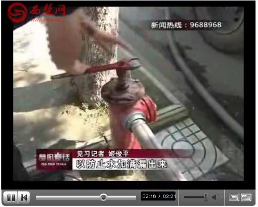 7月23日晚間,宿遷電視臺(tái)《楚風(fēng)夜話(huà)》欄目以“灑水除塵 我為城市降‘火’”為題,報(bào)道了環(huán)衛(wèi)部門(mén)每天給城區(qū)主干道灑水降溫的新聞。視頻中,我們通過(guò)鏡頭發(fā)現(xiàn)了以下三個(gè)問(wèn)題。第一是水車(chē)未在黃色消防栓上取水(如圖),第二是水帶和栓體及車(chē)體間的連接處漏水嚴(yán)重,第三是駕駛員在水箱注滿(mǎn)并溢出后,才關(guān)閉消防栓,沒(méi)有通過(guò)車(chē)輛外置的水位示管來(lái)控制。