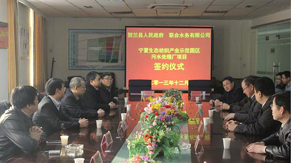 12月27上午,聯(lián)合水務(wù)有限公司與寧夏回族自治區(qū)賀蘭縣人民政府舉行了寧夏生態(tài)紡織示范園區(qū)污水處理項目的簽約儀式。集團(tuán)董事長兼總裁俞偉景先生、副總裁陳樵先生、總裁助理兼業(yè)務(wù)發(fā)展部總經(jīng)理豐洪斌先生、投資經(jīng)理常猛先生等出席簽約儀式。儀式由園區(qū)管委會常務(wù)副主任梅振龍先生主持。賀蘭縣委常委紀(jì)委書記俞學(xué)華先生、縣委常委常務(wù)副縣長何建勃先生、縣委常委副縣長王旭、人大副主任郭占清先生、政協(xié)副主席董志敏先生等出席。