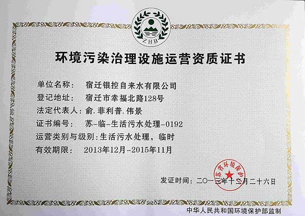 2014年1月9日,宿遷銀控自來水有限公司正式獲得江蘇省環(huán)保廳批發(fā)《環(huán)境污染治理設(shè)施運(yùn)營資質(zhì)證書》,該證書有效期限為2013年12月至2015年11月。如下圖: