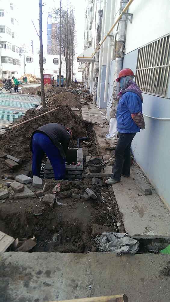 新園小區(qū)材料剛進場時,情況是:新的停車位基本成形,工人師傅正在貼道板磚;雨水井、弱電管線都已成形、入土。一眼望去,除了106棟,其他樓棟連下腳的地方都沒有,更別說溝槽開挖。
