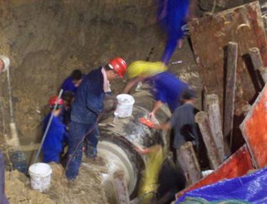 談到搶修,最為忙碌和艱苦的當(dāng)屬管網(wǎng)部的搶修人員。從凌晨五點(diǎn)鐘起,他們就一直不停地忙碌著。由于爆管處屬于雪峰公園內(nèi),管道埋深較深,挖機(jī)開(kāi)挖后,還需人工開(kāi)挖,同時(shí),此DN800源水管道是全市唯一的源水管道,為了盡量減少停水搶修對(duì)全城供水的影響,搶修前期全部帶水操作。現(xiàn)場(chǎng)施工過(guò)程中,遇到的困難要比預(yù)想的難度大得多,開(kāi)挖管道時(shí),由于管道壓力較大,土質(zhì)疏松,搶修人員剛一下水,就深深陷了進(jìn)去。兩臺(tái)大型挖掘機(jī)在緊張地做著接力工作,但是由于作業(yè)面下方有管道,加之施工點(diǎn)的粘土經(jīng)過(guò)涌出的原水浸泡后變得非常泥濘,兩臺(tái)大力士也只能小心翼翼地騰挪手腳。盡管如此,他們沒(méi)有一個(gè)人動(dòng)搖松懈過(guò),他們一直堅(jiān)持不斷地努力開(kāi)挖。公司夏承光總經(jīng)理在現(xiàn)場(chǎng)指揮作業(yè)時(shí)強(qiáng)調(diào):既要保證工程質(zhì)量;又要保證人員、設(shè)備安全,千萬(wàn)不能急于求成。