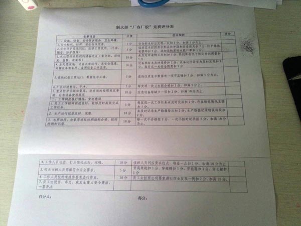 此次競賽分別圍繞設(shè)施、設(shè)備、安全防護(hù)用品、衛(wèi)生環(huán)境,工作制度執(zhí)行情況、安全意識等競賽內(nèi)容進(jìn)行打分,由陳總帶領(lǐng)的考核小組進(jìn)行每周不定期的監(jiān)督檢查,對檢查中發(fā)現(xiàn)的問題及時通報(bào)相關(guān)負(fù)責(zé)人,進(jìn)行整改。