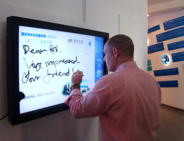 最后,柏安倫先生對來到宿遷銀控自來水有限公司參觀感到非常的高興,宿遷銀控自來水有限公司公益性、科普性的水文化展示館和先進的制水工藝流程給他留下了深刻的印象。并留言板上留下了“Dear all ,very impreesed ,your friend from ISRAEL.”劉總裁誠摯地邀請柏安倫先生能再來參觀并在水文化展示館前合影留念。