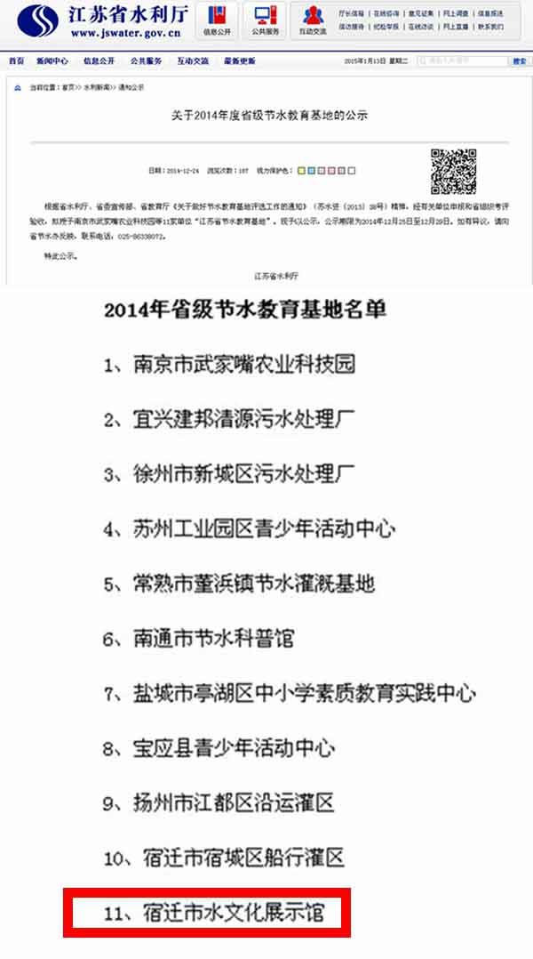 2014年12月24日,宿遷市水文化展示館以95分的高分順利通過(guò)“江蘇省節(jié)水教育基地”現(xiàn)場(chǎng)專(zhuān)家組評(píng)審后。2014年12月24日至29日,在省利水對(duì)2014年度省級(jí)節(jié)水教育基地結(jié)果在網(wǎng)站首頁(yè)進(jìn)行為期五天的公示,在公示期內(nèi),無(wú)異議,宿遷市水文化展示館正式獲評(píng)“江蘇省節(jié)水教育基地”。