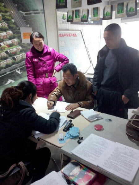 (圖:宿遷公司員工在三樹(shù)新城現(xiàn)場(chǎng)為客戶(hù)簽合同)
