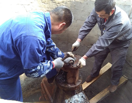 事發(fā)突然,刻不容緩!趙主任立即組織機(jī)電設(shè)備部、制水部?jī)刹块T(mén)工作人員趕往現(xiàn)場(chǎng)啟動(dòng)應(yīng)急預(yù)案。首先啟用運(yùn)河泵站恢復(fù)一水廠的供水,并且啟用運(yùn)河泵站活性炭的應(yīng)急投加以確保水質(zhì);隨后安排人員查找流量突然降低的原因,經(jīng)過(guò)工作人員的連夜檢查發(fā)現(xiàn)駱馬湖泵站往一水廠供水的DN1200閥門(mén)聯(lián)軸器斷裂造成閥門(mén)無(wú)法打開(kāi)。由于此型號(hào)閥門(mén)聯(lián)軸器已經(jīng)停產(chǎn),聯(lián)軸器需要由廠家重新加工更換,為了節(jié)約維修時(shí)間,趙主任一邊和廠家取得聯(lián)系,一邊安排人員對(duì)損壞的聯(lián)軸器進(jìn)行拆除并檢查損壞原因,確定為鑄鐵聯(lián)軸器老化造成斷裂。