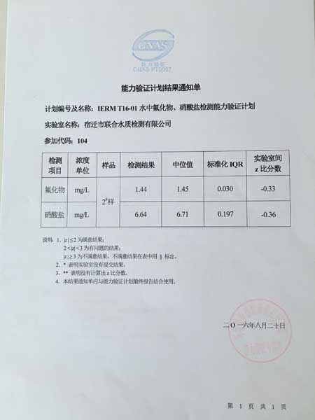 首批能力驗證項目是水中氟化物、硝酸鹽的檢測,經(jīng)過前期準備,4月19日收到能力驗證的樣品后,在規(guī)定的工作日時限內,順利地提交了檢測結果和有關資料。能力驗證的結果,是按照與真值比較的偏差進行計算分類,一般分為 “滿意結果”、“有問題的結果”、“不滿意結果”三種。經(jīng)過幾個月的漫長等待,終于于近日接到環(huán)保部的結果通知單,本次參加的檢測項目檢測評價結果為“滿意”。