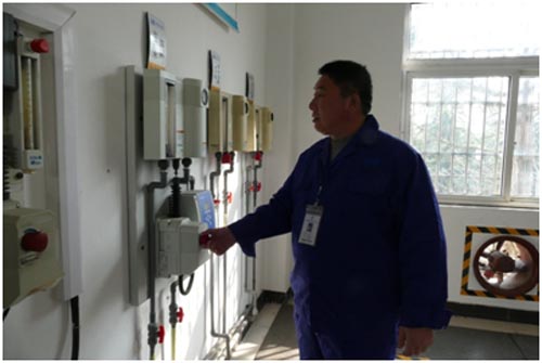 (圖7:生產(chǎn)人員專心調(diào)試加藥設(shè)備刻度)