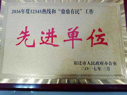為表彰先進(jìn)、樹立榜樣,切實(shí)提高電子政務(wù)辦理水平,宿遷市人民政府辦公室對2016年度在宿遷市電子政務(wù)工作取得優(yōu)秀成績的企事業(yè)單位進(jìn)行通報(bào)表彰,宿遷公司榜上有名,被授予“2016年度12345熱線、鼎鼎有民工作先進(jìn)單位”榮譽(yù)稱號。