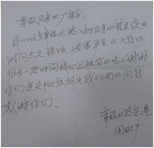 一封皺皺巴巴的感謝信送到了宿遷銀控自來水有限公司,最樸實的話語卻蘊含了最真切的情感,感激之情躍然紙上,署名“幸福北路東三巷用水戶”。對于這個署名,宿遷銀控自來水有限公司管網(wǎng)部維修主管韓超并不陌生,他說,自2016年8月份公司積極出資投身老舊城區(qū)改造惠民工程,對老舊困難小區(qū)供水管網(wǎng)的“跑、冒、滴、漏”和水質(zhì)安全隱患等問題進行供水設(shè)施改造,解百姓用水燃眉之急。每一處改造的艱難,每一位老百姓期盼的眼神,每一次用水戶的盛情我都記憶猶新:天氣熱,面對維修人員汗流浹背還在不停工作,他們會把水送到面前,讓維修人員喝,并熱情邀請維修人員到家里坐下歇一歇;天氣冷時,面對維修人員凍紅的雙手,他們會把熱茶端到面前,讓維修人員暖暖手……改造結(jié)束時,看到順暢流出的來自清清駱馬湖的自來水,用水戶們欣喜不已,僅僅握著維修人員的手不停道謝,說政府應(yīng)該給予嘉獎。其實,老百姓的這份深情厚誼就是對我們供水人最大的嘉獎。