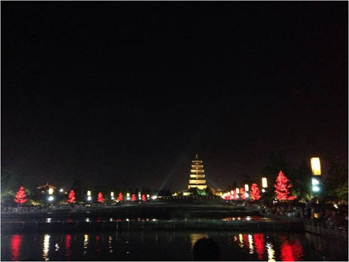 等我們趕到的時(shí)候,廣場(chǎng)上已經(jīng)站滿了游客。站在我們身前的是兩個(gè)來(lái)自烏克蘭的高挑的美女留學(xué)生,一八三的我都要稍稍墊腳才可以不被兩個(gè)姑娘擋住。音樂(lè)噴泉升起的時(shí)候,水珠四散,兩個(gè)姑娘不住驚呼“Oh,My God!”。噴泉升起,再加上安裝在廣場(chǎng)上五顏六色的彩燈發(fā)出的光芒,遠(yuǎn)處是一千多年的歷史的大雁塔,歷史的厚重和現(xiàn)代的時(shí)尚巧妙地融合在了一起。留給所有見(jiàn)證過(guò)這一幕的人們一個(gè)曼妙美麗的回憶。