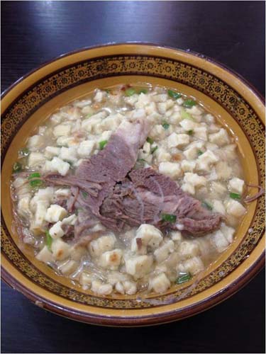久負(fù)盛名的回民街就在鐘鼓樓廣場(chǎng)的不遠(yuǎn)處,我們正是饑腸轆轆的時(shí)候,正好可以到這個(gè)早已經(jīng)如雷貫耳的美食街上大快朵頤一番。陜西正宗肉夾饃、羊肉泡饃、秦正涼皮、岐山臊子面、大串的烤面筋,好像一時(shí)間自己的味蕾和嗅覺(jué)已經(jīng)完全不夠用了。第一次真正見(jiàn)識(shí)到西北人民粗獷豪邁的吃食,已經(jīng)來(lái)不及去感慨華夏幾千年來(lái)歷史給這片西北土地的豐厚饋贈(zèng)了!從古老的建筑遺跡到傳承不歇的秦腔古調(diào),還有這些令人一想到名字都會(huì)覺(jué)得垂涎欲滴的美食。我們糾結(jié)于究竟要選擇哪一家美食很久,終于選定了一家賣(mài)羊肉泡饃的店,老板操著一口地道的關(guān)中方言給我們介紹店內(nèi)的美食,最終我們要了三碗羊肉泡饃和十串烤面筋。羊肉泡饃做得料重味醇,肉爛湯濃,肥而不膩??久娼钍窍憷庇形?,入口酥脆。現(xiàn)在想來(lái)仍然覺(jué)得口水直流。