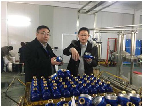 12月28-29日宿遷銀控自來水有限公司副總經(jīng)理尹邦交到江陰立信智能設(shè)備有限公司和南京水門電子有限公司考察遠傳水表生產(chǎn)情況,上??偛坷钪袕娭鞴?、水表檢定中心主任張黎明共同參加考察。