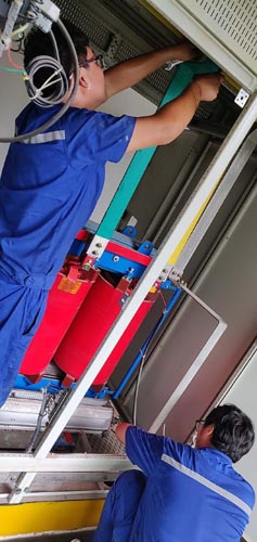 方案確定后,制水部門與機電部門立即行動起來,為盡量爭取搶修時間,人員兵分兩路,一路由機電部涂經(jīng)理帶領(lǐng),著手拆除三棵樹泵站損壞變壓器。另一路由朱經(jīng)理帶領(lǐng)立即驅(qū)車前往倉集泵站拆除備用變壓器。由于兩個泵站配電間空間狹窄,大門高2米寬1.7米,造成現(xiàn)場操作不便,無法使用大型機械,但變壓器重量達到1.5噸,一時間維修工作陷入困境。后經(jīng)多方聯(lián)系,終于找到體積和起重能力均能滿足現(xiàn)場要求的叉車進入操作,維修工作得以順利開展。