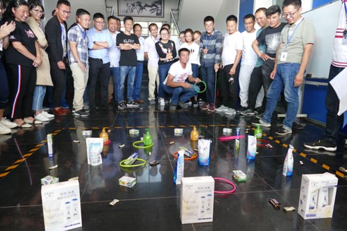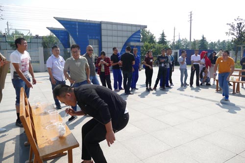 第二個(gè)環(huán)節(jié)是單人項(xiàng)目“運(yùn)送小球”。參賽隊(duì)員通過(guò)吸管吸住乒乓球(比賽全程不得用手觸碰乒乓球,運(yùn)球途中,乒乓球落地,則返回原地重新開(kāi)始)將乒乓球送到指定地點(diǎn)杯中,賽程2米,2分鐘時(shí)間內(nèi)運(yùn)送乒乓球的個(gè)數(shù)計(jì)為成績(jī)。4人一組同時(shí)比賽。剛開(kāi)始,財(cái)務(wù)部經(jīng)理許應(yīng)濤以13球的好成績(jī)暫居第一,他正沾沾自喜,后邊的選手卻不服氣揚(yáng)言要挑戰(zhàn),嬉笑斗鬧,如火如荼。果然,第四組次,皂河服務(wù)中心韓小東以16球打破紀(jì)錄,許經(jīng)理眼看奪冠無(wú)望,在大家調(diào)侃聲中“灰溜溜”離場(chǎng)。接下來(lái)的比賽現(xiàn)場(chǎng),熱鬧依舊,一個(gè)個(gè)隊(duì)員屏住呼吸,憋住氣,全神貫注地運(yùn)球,完全進(jìn)入忘我狀態(tài),但是也有很多人經(jīng)不住場(chǎng)外人員的玩笑逗鬧,忍不住笑起來(lái),小球就趁機(jī)逃脫了,技術(shù)部薛江寧經(jīng)理就屢屢中招,每到中途球就掉落,慌忙去逮球,不時(shí)惹得在場(chǎng)人員捧腹大笑,最終也沒(méi)能實(shí)現(xiàn)“零”的突破。而同組次的徐曉猛,卻是一匹“黑馬”,成功送進(jìn)17球,拔得頭籌。結(jié)果是其次的,重要的是歡樂(lè)開(kāi)懷、努力拼搏的過(guò)程。