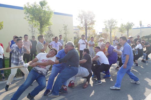 在陣陣歡呼聲中,輕松愉悅的套圈游戲結(jié)束了。緊接著就是令群情激奮的壓軸大戲,也是每年國(guó)慶活動(dòng)的傳統(tǒng)團(tuán)體項(xiàng)目——拔河比賽。本次拔河比賽共分4隊(duì):工程公司代表隊(duì)、生產(chǎn)技術(shù)聯(lián)隊(duì)、客服運(yùn)營(yíng)聯(lián)隊(duì)及行政辦公與污水處理聯(lián)隊(duì),每隊(duì)15人(女隊(duì)員不低于5人),采取抽簽方式捉對(duì) “廝殺”,三局兩勝。在兩組勝方中再?zèng)Q出冠軍。經(jīng)過(guò)第一輪比賽,行政辦公聯(lián)隊(duì)、工程公司隊(duì)惜敗,生產(chǎn)技術(shù)聯(lián)隊(duì)、客服運(yùn)營(yíng)聯(lián)隊(duì)晉級(jí)。雖然奪冠無(wú)望,但是,行政辦公聯(lián)隊(duì)與工程公司代表隊(duì)決意為榮譽(yù)而戰(zhàn)!分管污水項(xiàng)目的總經(jīng)理助理蔡猛親自披掛上陣,帶領(lǐng)隊(duì)伍一舉擊潰工程公司對(duì),終于擺脫了千年“吊車尾”的帽子!接下來(lái),迎來(lái)了全天比賽的重頭戲:冠軍大戰(zhàn)!由生產(chǎn)技術(shù)聯(lián)隊(duì)迎戰(zhàn)客服運(yùn)營(yíng)聯(lián)隊(duì)。強(qiáng)強(qiáng)對(duì)決,勢(shì)均力敵,雙方隊(duì)員虎視眈眈,以“箭在弦上,一觸即發(fā)”之勢(shì),準(zhǔn)備做最后一搏。哨聲一響,領(lǐng)隊(duì)的號(hào)子聲、隊(duì)員的吶喊聲、啦啦隊(duì)的助威聲響徹云霄。盡管生產(chǎn)技術(shù)的猛將巾幗奮力拼搏,奈何對(duì)手經(jīng)驗(yàn)豐富,實(shí)力雄厚,在領(lǐng)隊(duì)顧全局經(jīng)理的指揮下,象征勝利的掛繩最終越過(guò)標(biāo)線,客服運(yùn)營(yíng)聯(lián)隊(duì)以2:0的絕對(duì)優(yōu)勢(shì)獲得最終的勝利。