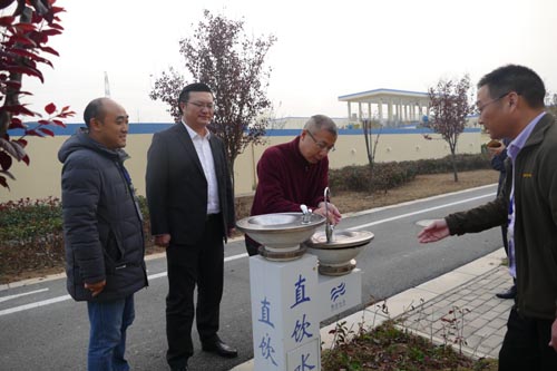 接下來,俞總來到第二水廠生產(chǎn)廠區(qū)視察廠區(qū)建設(shè)、生產(chǎn)工藝流程等。途經(jīng)廠區(qū)停車場(chǎng),看到眾多停放整齊有序的轎車,得知都是公司員工的私家車時(shí),俞總感到由衷的欣慰。他說,聯(lián)合水務(wù)的每一位員工都是我們的親人,他們工作舒心、生活順心、富足是我們的責(zé)任、追求與榮耀。經(jīng)辦公區(qū)與生產(chǎn)區(qū)隔離的指紋鎖二道門進(jìn)入生產(chǎn)區(qū),俞總對(duì)廠區(qū)嚴(yán)謹(jǐn)?shù)陌卜来胧┙o予了好評(píng)。視察途中,他不斷與生產(chǎn)人員親切交流,了解生產(chǎn)工藝流程的細(xì)節(jié),并給出中肯的點(diǎn)評(píng)與建議。在二期深度處理炭濾池,俞總對(duì)池體的設(shè)計(jì)建設(shè)提出了意見和建議。從深度處理炭濾池拾階而下,便是直飲水處。俞總不顧冬季水涼,親自品嘗,對(duì)口感表示滿意。在三期沉淀池上,俞總舉目遠(yuǎn)眺,曾真總經(jīng)理介紹了已經(jīng)成功立項(xiàng)的四期擴(kuò)建項(xiàng)目情況,俞總提出要求按照繪就的藍(lán)圖全力建設(shè),保障安全供水。