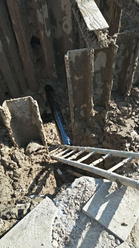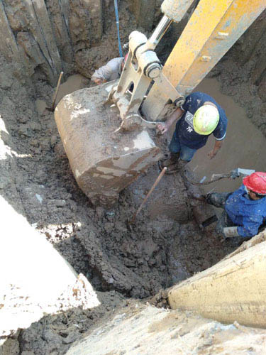 在做好各項準(zhǔn)備工作之后,晚上23點半,正式開始維修開挖。開挖過程中,由于積水較多,搶修人員不得不一邊開挖一邊排水,加之管道埋深高達(dá)6米多,不停造成塌方。維修人員沉著應(yīng)戰(zhàn),直至第二天早上9時30分才將被頂壞的供水管道挖出來。經(jīng)檢查,漏點為DN300鋼管,大小為30*20公分。由于管道旁邊就是雨污水管道施工的盾構(gòu)機(jī),維修地點情況比較復(fù)雜,經(jīng)現(xiàn)場搶修人員商定暫將破損管道兩側(cè)加設(shè)盲板,封堵漏水,暫時保證南北兩側(cè)的正常供水,之后再行細(xì)化搶修方案。