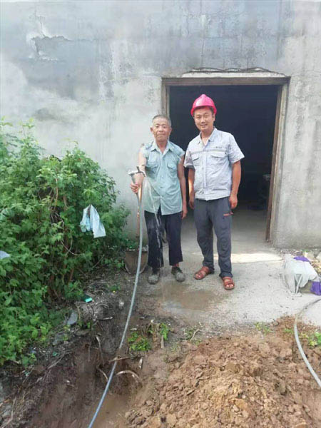 穿過泥濘的小路、臟亂的垃圾站和一片農(nóng)田,一行人終于抵達老人的家。屋內(nèi)家徒四壁,悶熱潮濕,墻腳堆積老人多天換下來的臟衣服。老人說,之前用水都是到附近的鄰居家挑水,一個人用水不多也不算困難,現(xiàn)在天氣炎熱,用水量大,挑水就非常不便??吹窖矍暗木跋螅趫龅娜藷o不深受觸動,客服部副經(jīng)理陳美菊耐心溫和地安撫老人的情緒,并將老人的情況向公司領導報告,公司領導當即電話指示:免去一切安裝費用,立即為老人家安裝自來水。管網(wǎng)部副經(jīng)理韓超當即組織人員進行管網(wǎng)勘查,確定安裝方案,安排維修員申領材料,開展安裝工作。