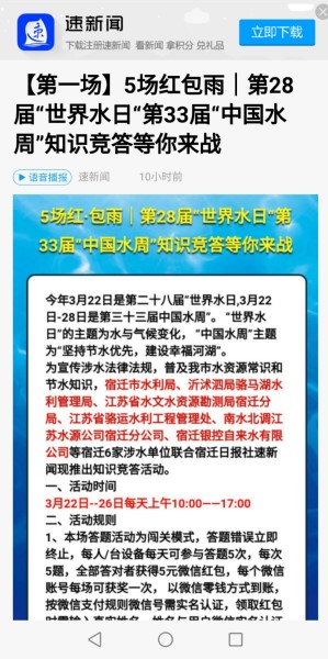 全民總動員開始啦!網(wǎng)絡(luò)倡議書簽名轉(zhuǎn)發(fā)活動,倡議書內(nèi)容豐富,既有宿遷市水資源知識,還有節(jié)水小竅門呢,以百姓喜聞樂見的微信群、通過微信群、微信朋友圈方式進行轉(zhuǎn)發(fā);網(wǎng)絡(luò)答題贏紅包活動,5場“紅包雨”,第28屆“世界水日”、第33屆“中國水周”知識全民競技,寓教于樂;意見建議征集活動,保護水資源,你獻計,他獻策,水更清、城更美,民更樂;網(wǎng)上攝影展活動,用鏡頭拍下最美水景,感受水鄉(xiāng)靈韻;水美文章征文活動,分享《童年的河》,一水一情,讓故鄉(xiāng)的水在心間流淌;彩印卡片+鮮花贈送活動,水法宣傳不見面,投放在銀行、商場、醫(yī)院、公園、公交站臺等公共場所,全民知法、懂法、守法,愛護水源,人人有責(zé)。宿遷銀控自來水有限公司動員公司全體員工積極參與各類活動,以實際行動支持節(jié)水、護水、愛水行動。