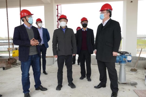 不顧舟車勞頓,俞總裁一行首先來(lái)到在建的第二水廠四期擴(kuò)建工程現(xiàn)場(chǎng)。集團(tuán)建設(shè)管理部副總經(jīng)理葉峰向俞總一行介紹項(xiàng)目概況及進(jìn)展情況。第二水廠四期擴(kuò)建項(xiàng)目是在母公司聯(lián)合水務(wù)集團(tuán)大力支持下,宿遷公司為適應(yīng)宿遷市經(jīng)濟(jì)社會(huì)的快速發(fā)展,未雨綢繆建設(shè)的工程,是宿遷市重點(diǎn)民生工程。該工程建設(shè)規(guī)模15萬(wàn)噸/日,建設(shè)采用網(wǎng)格絮凝+平流沉淀池與清水池疊合工藝,使水處理構(gòu)筑物結(jié)構(gòu)更緊湊, 提升了土地使用率,凈水工藝采用先進(jìn)的“臭氧+活性炭”的深度處理方式。該工程于2019年9月開工建設(shè),今年7月高峰供水來(lái)臨前投入運(yùn)行,屆時(shí),宿遷項(xiàng)目公司的供水能力將達(dá)43萬(wàn)噸/日,極大滿足城市發(fā)展供水需求。疫情給工程建設(shè)造成了一定的阻擾,但項(xiàng)目部在積極響應(yīng)政府各項(xiàng)防控疫情政策前提下,千方百計(jì)克服困難,保證工程建設(shè)進(jìn)度,目前各項(xiàng)施工及設(shè)備采購(gòu)、安裝已逐漸步入正軌。俞總裁對(duì)四期擴(kuò)建項(xiàng)目的設(shè)計(jì)規(guī)劃、土建施工、建設(shè)管理等給予了充分肯定,并提出了繼續(xù)努力,按期保質(zhì)保量完成項(xiàng)目建設(shè),為宿遷百姓安全供水做好保障的殷切期望。