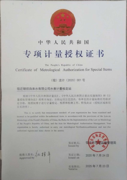 經(jīng)過(guò)現(xiàn)場(chǎng)嚴(yán)格考核,根據(jù)《中華人民共和國(guó)計(jì)量法》、《中華人民共和國(guó)計(jì)量法實(shí)施細(xì)則》《計(jì)量授權(quán)管理辦法》的有關(guān)規(guī)定,考核組認(rèn)為:宿遷銀控自來(lái)水公司水表計(jì)量檢定站,嚴(yán)格按照宿遷市市場(chǎng)監(jiān)督管理局要求開(kāi)展水表計(jì)量檢定工作,全面履行《計(jì)量法》賦予的職責(zé)和義務(wù),依法辦事,為政府行政計(jì)量部門(mén)實(shí)施計(jì)量監(jiān)督提供可靠的技術(shù)保證,圓滿(mǎn)通過(guò)現(xiàn)場(chǎng)考核。8月7日檢定站取得中華人民共和國(guó)《專(zhuān)項(xiàng)計(jì)量授權(quán)證書(shū)》,更為欣喜的是本次《專(zhuān)項(xiàng)計(jì)量授權(quán)證書(shū)》授權(quán)期限由往常的3年延長(zhǎng)至5年,授權(quán)有效期至2025年7月23日。