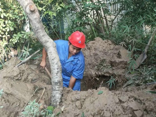 盤根錯(cuò)節(jié)間抽繭剝絲忙搶修。老舊小區(qū)的管道鋪設(shè)往往無(wú)章可循,隱匿于綠化樹下的比比皆是。宿遷銀控供水公司管網(wǎng)部的馬振接到報(bào)修后,緊急趕往府苑小區(qū)現(xiàn)場(chǎng),水從一片竹林滲出,成片綠植生長(zhǎng)多年,根系發(fā)達(dá)且盤根錯(cuò)節(jié),只能人工用鐵鍬一點(diǎn)點(diǎn)開挖查找漏水點(diǎn),身上、臉上是汗水,褲腿是泥水,和著稀泥,樹根很滑,一根根挖斷,慢慢剝離出管道,緊急搶修好,帶著一身泥濘,趕赴下一個(gè)搶修點(diǎn)。