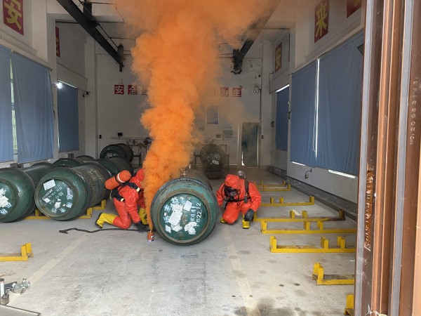 (圖:現(xiàn)場處置組對鋼瓶進行堵漏)