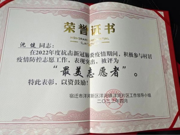 此輪疫情期間,洋河服務(wù)中心共組織14人次參加洋河新區(qū)交通建設(shè)局組織的志愿服務(wù)活動(dòng),12人次參加防疫維穩(wěn)工作。居家辦公員工就近參加社區(qū)服務(wù),中心員工劉瑋、沈建,化身為社會(huì)防疫工作的 “大白”,積極參與防疫工作。4月18日,洋河新區(qū)授予沈健“最美志愿者”稱(chēng)號(hào)。