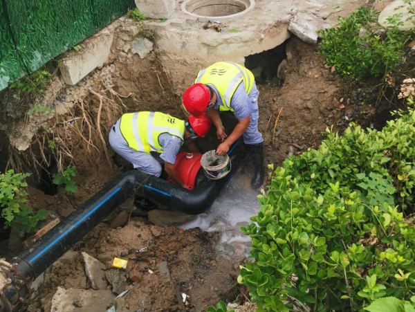 維修人員到達現(xiàn)場后,立即關(guān)閉該段閥門,并發(fā)出停水通知。由于該供水管道擔(dān)負著金雞湖路周邊百余家工廠和附近居民的用水,維修員們一刻沒有停歇,摸清管道基本情況后,在公司領(lǐng)導(dǎo)的帶領(lǐng)下迅速制定好搶修方案。