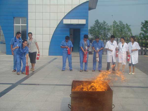 15時31分,在綜合樓南面出現(xiàn)1個模擬燃燒點。第一個發(fā)現(xiàn)火情的人根據(jù)現(xiàn)場情況首先向值班領(lǐng)導(dǎo)匯報了火災(zāi)現(xiàn)場情況,隨后立即按下火警報警器,拉響廠區(qū)內(nèi)警報系統(tǒng)以提示無關(guān)人員有序撤離。此時,滅火組成員在接到值班領(lǐng)導(dǎo)的搶救命令時,迅速裝備開車前往。在著火現(xiàn)場,按照公司制定的操作規(guī)程進(jìn)行滅火,經(jīng)過共同努力,于15時36分成功撲滅火源,應(yīng)急演練順利結(jié)束。