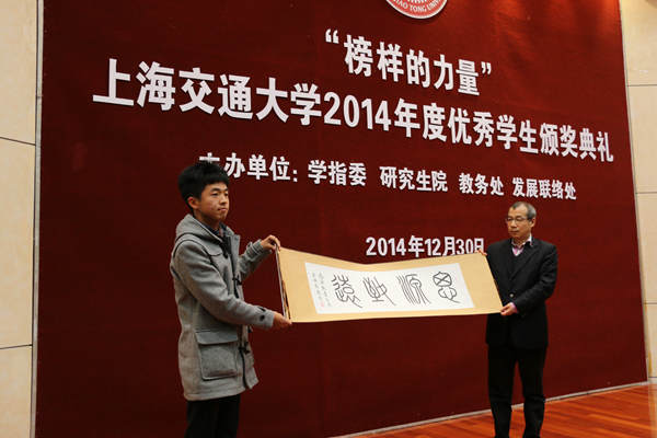 2014年12月30日下午,“榜樣的力量”——上海交通大學(xué)2014年度優(yōu)秀學(xué)生頒獎(jiǎng)典禮在交大閔行校區(qū)陳瑞球樓報(bào)告廳舉行。上海交通大學(xué)黨委書記姜斯憲、黨委副書記朱健、副校長(zhǎng)張安勝、副校長(zhǎng)徐學(xué)敏,知名教授劉西拉、俞勇、李亦中、施索華,各院系單位負(fù)責(zé)人、設(shè)獎(jiǎng)單位代表及部分學(xué)生代表出席了會(huì)議。聯(lián)合水務(wù)集團(tuán)董事長(zhǎng)兼總裁俞偉景及其他捐贈(zèng)方負(fù)責(zé)人共同出席并為捐贈(zèng)獎(jiǎng)學(xué)金的獲獎(jiǎng)?wù)哌M(jìn)行頒獎(jiǎng)。