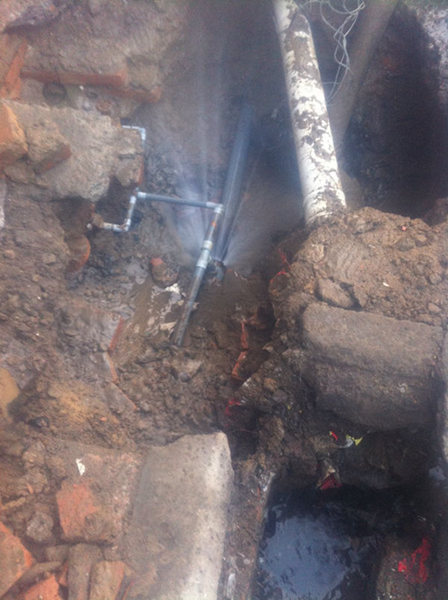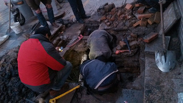 2015年1月22日下午16時(shí)10分,宿遷公司管網(wǎng)部接到群眾反映,楚街農(nóng)家小院門前管道漏水,管網(wǎng)部韓超立刻安排維修人員搶修設(shè)備。16時(shí)24分維修人員到達(dá)現(xiàn)場(chǎng)。因現(xiàn)場(chǎng)漏水較多,為縮小停水范圍,現(xiàn)場(chǎng)維修人員被分為兩組,一組進(jìn)行鑿?fù)?,一組尋找分支閘閥。經(jīng)過大家的共同努力, 17時(shí)27分,漏點(diǎn)被發(fā)現(xiàn),確認(rèn)原因?yàn)镻E63*32異徑三通處漏水。