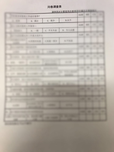 新的一年,宿遷公司的各項工作也在集團的指導和帶領(lǐng)下步入了一個全新的開端,而就在新年伊始,宿遷公司人事行政模塊也開創(chuàng)了宿遷公司多年以來的第一次“員工評議領(lǐng)導”的先河。宿遷公司人力資源部在分管領(lǐng)導陳總的要求下制定了《問卷調(diào)查表》。