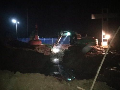 9月22日下午17點20分,宿遷銀控自來水有限公司接到緊急報修電話:上海路DN800供水主管道因沿線道路施工導致爆管,現(xiàn)場水流如柱。管網(wǎng)部經(jīng)理丁海三接到通知后,立即趕赴現(xiàn)場了解情況。該段管道擔負著向三棵樹、陳林、倉集三座增壓泵站輸水的重任,爆管直接影響洋河新區(qū)、龍河、中揚、陳集等10個鄉(xiāng)鎮(zhèn)居民的用水。因漏水嚴重,三棵樹泵站的進水量已急劇下降,將會導致大面積的停水。情況緊急,丁海三立即向公司領(lǐng)導進行匯報。公司總經(jīng)理曾真指示:1、緊急啟動爆管搶修應急預案;2、向市水務局報告;3、緊急啟用鄉(xiāng)鎮(zhèn)應急備用水源,降低影響。同時,總經(jīng)理助理郁莉和工程公司總經(jīng)理梁丹趕往現(xiàn)場查看情況,并會同生產(chǎn)副總經(jīng)理趙軍制定具體搶修方案,成立搶修小組,建立“上海路搶修微信群”,隨時發(fā)布信息和指導搶修。
