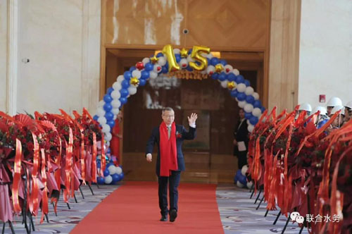 踏平坎坷成大道。一條紅毯,記載了聯(lián)合水務(wù)集團(tuán)砥礪奮進(jìn)的十五年所走過的光輝歷程。帶有“祝賀聯(lián)合水務(wù)集團(tuán)成立十五周年”、“祝賀聯(lián)合水務(wù)宿遷銀控自來水有限公司成立十五周年”紅飄帶的一個個花籃夾道兩邊。伴隨著身著整齊工裝的員工們的熱烈掌聲,下午14:08分,聯(lián)合水務(wù)集團(tuán)總部和19個項目公司的領(lǐng)導(dǎo)們踏上紅毯、在“聯(lián)合水務(wù)成立十五周年簽名墻”上簽字后,步入會場。鮮花總與汗水相伴,領(lǐng)導(dǎo)們堅定的步伐、挺拔的身姿、蒼勁的筆鋒正是聯(lián)合水務(wù)人百折不撓、奮勇向前的真實寫照。